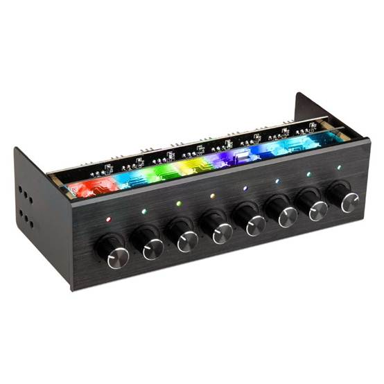 Above each knob is an LED with 8 different colours available to help keep track of which fan is which. The controller is connected via 4-pin Molex to the power supply. The fans are connected via 4-pin. They come complete with eight 4-pin extension cable.